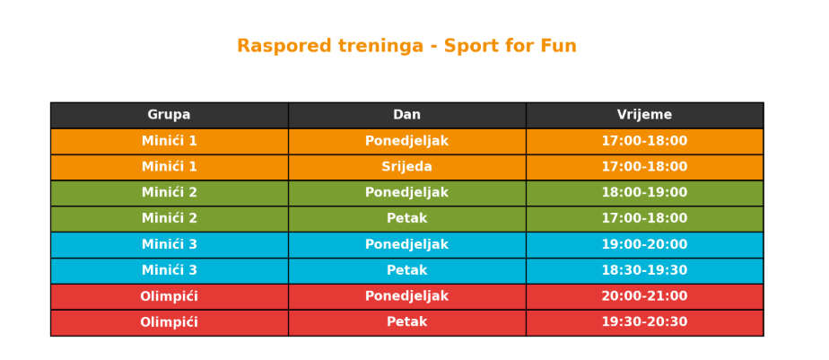Termine treninga možete pronaći u tablici. Djeca su raspoređena u grupe prema dobi.